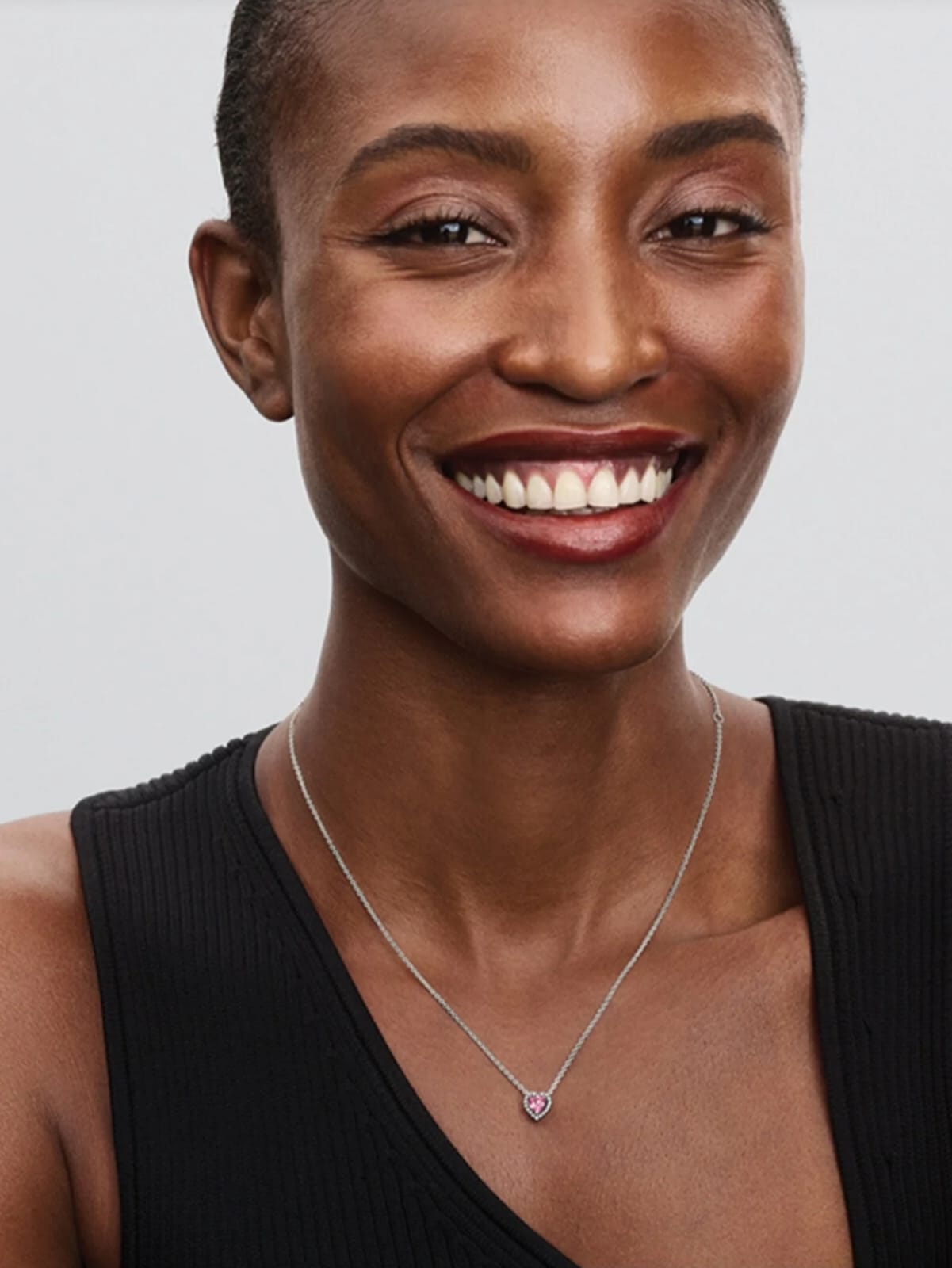 Pembe Yükseltilmiş Kalp Kolye ile stiline sıcak tonlu bir detay ekle. 925 ayar gümüşten üretilen bu kolyenin merkezinde, kalp şekilli ışıltılı pembe taşlı bir kolye ucu yer alıyor. Yükseltilmiş orta taş pavé ile çevrili. Zincirin uzunluğu ayarlanabilir ve kolye ucunun zincir boyunca kayabilmesini sağlıyor, ancak kolye ucu zincirden çıkarılamıyor. Sevgi ve minnettarlık duygularından ilham alan bu kolye, kalpten gelen sıcak ve parlayan duyguları yansıtıyor.